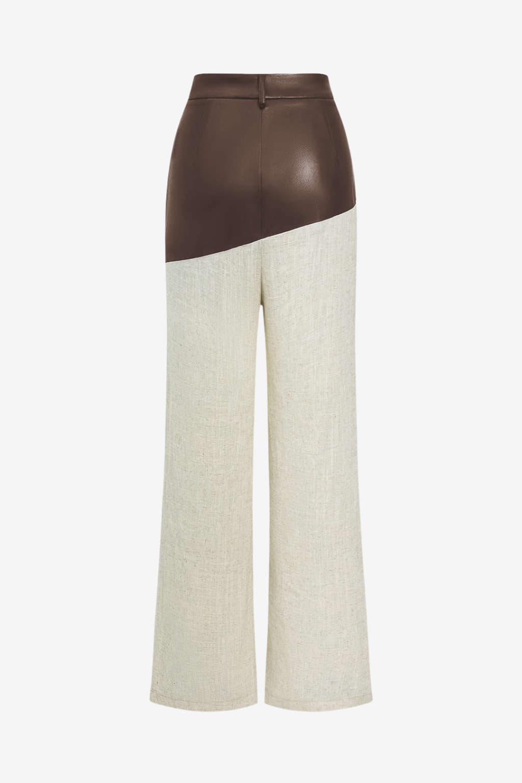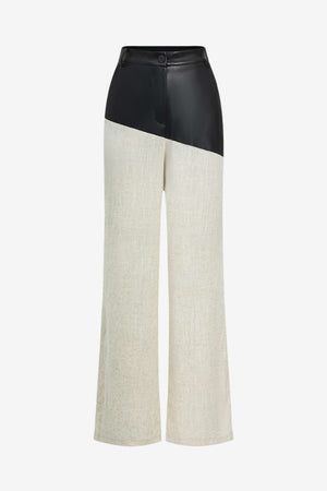 Women's High-Waisted Wide-Leg Trousers feature a two-tone design with smooth and structured textiles. The tailored fit and contrasting textures offer a modern silhouette, ideal for women seeking a versatile option for daily wear. Suitable for various occasions, these trousers provide a balanced look for casual settings.- Fitted Waist: High-waisted design with defined waistband fits multiple body shapes.