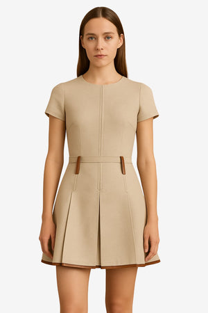 The Women's Khaki Pleated Mini Skirt is a casual A-line bottom with a loose fit. Made from medium-weight, non-sheer fabric, it features a structured surface, suitable for women seeking a neutral piece for daily wear.- Loose Fit: A-line silhouette, 27.6" waist, 38.6" hips in size S.