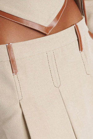 - Decorative Details: Brown trim on hemline, waistband, and tabs at waist.