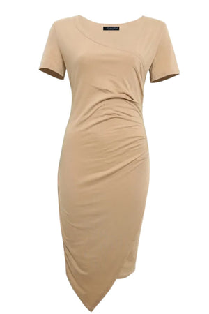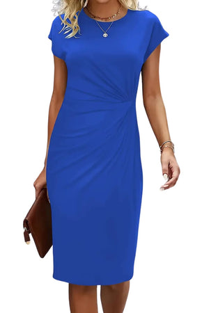 This knee-length sheath dress presents a close-fitting outline with side-gathered waist shaping for subtle dimension. Built with a smooth surface and flexible material, the structure emphasizes line continuity and mid-length coverage suitable for multiple settings. The design maintains a clean appearance with minimal decorative elements.- Round neckline: A modest neckline with a curved finish positioned to frame the collar area.