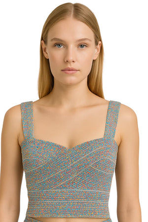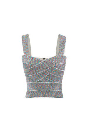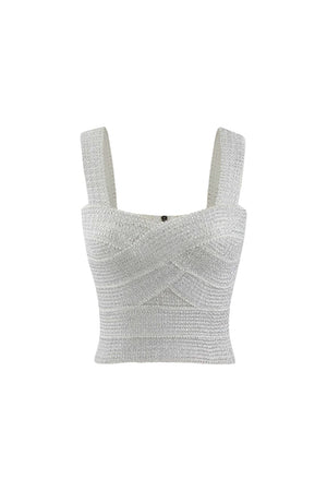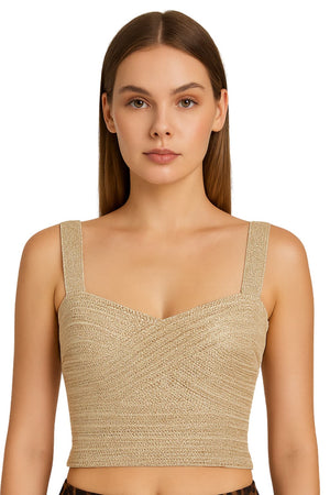 This women's knit crop top combines a close-fitting structure with patterned detailing for a neutral, compact look. Featuring a sleeveless shape and cropped hem, it's made for settings where lighter garments are preferred. Constructed to maintain a shaped outline, it pairs well with high-rise bottoms and presents a defined surface texture.- Structured fit: Formed to align with the body's contours, providing a stable shape without excess looseness.