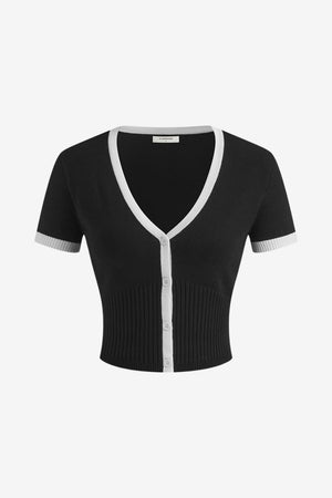 - Defined V-neckline and button front: Trimmed neckline and button closure provide structure and alignment on the upper piece.