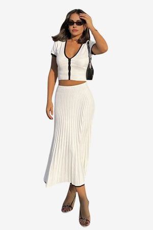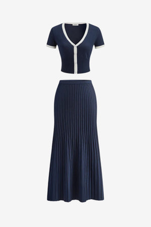 This two-piece skirt set includes a cropped short-sleeve top and a pleated midi skirt with a unified appearance. The pieces are shaped with consistent surface detailing and finished with trim accents for visual alignment. Designed for various settings, the set maintains a defined silhouette without excess decoration.- Coordinated two-piece outfit: Includes a short-sleeve top and high-waisted skirt designed to form a matched ensemble.