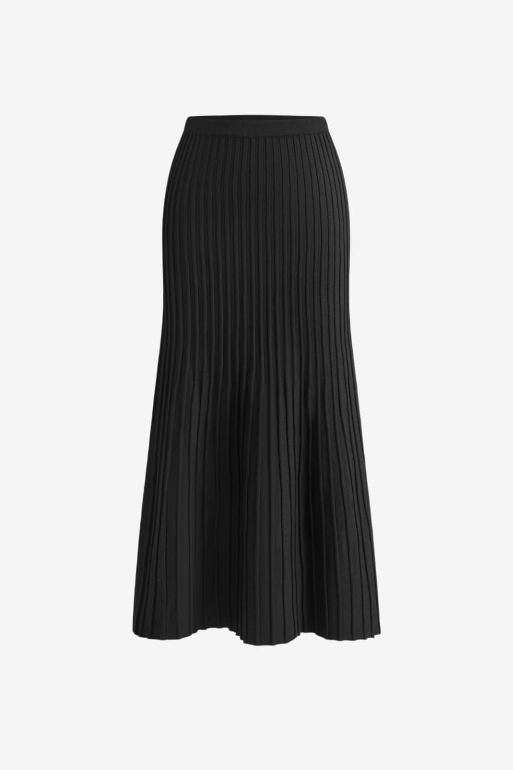 - Pleated knit skirt: Ribbed surface extends vertically from the waist to create a downward flowing shape.