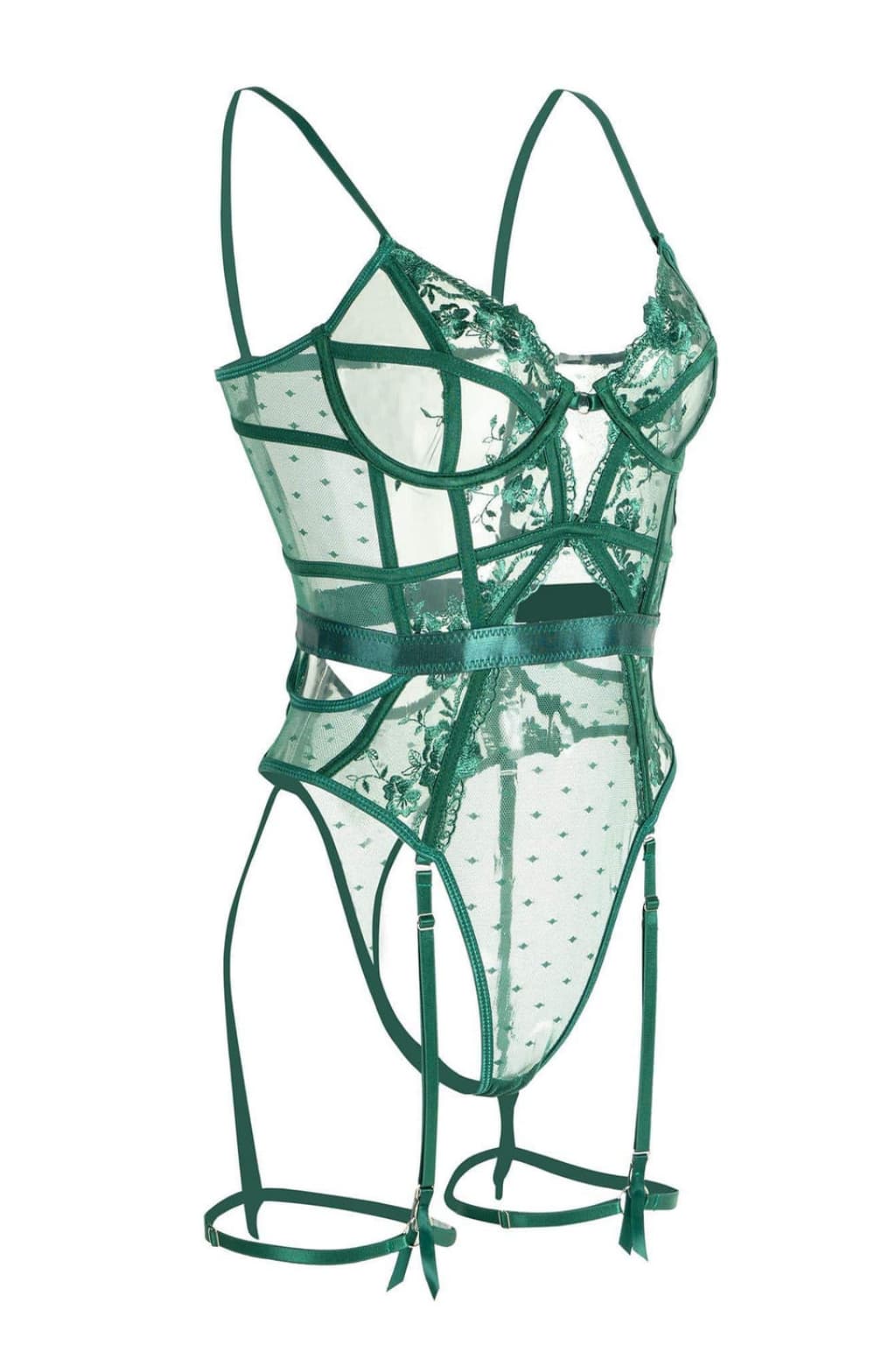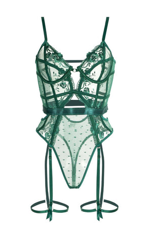 This women’s lace bodysuit includes an underwired base and integrated garter connectors, combining shaped lines with fine surface detailing. Emerald-toned lace and mesh panels create a layered appearance, while adjustable components support fit modifications. Developed as a piece for styled layering or standalone use, it maintains a structured outline suitable for varied ensembles.- Underwired cup framework: Incorporates built-in elements that shape the bust area with a defined form.