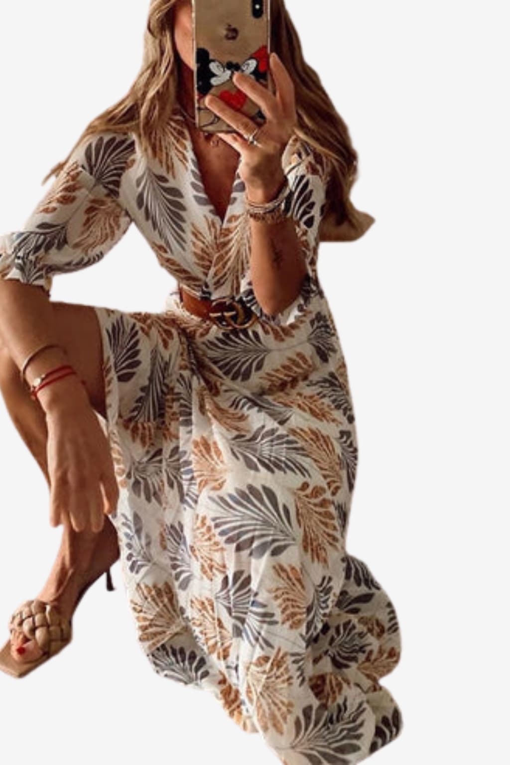 Women's Leaf Print V-Neck Maxi Dress with Belt