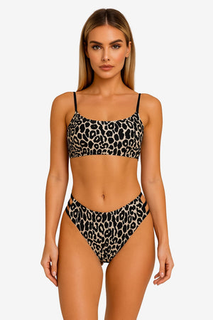This two-piece women's swim set features a high-waist design combined with a contrasting leopard-inspired print. Built with adjustable elements and structured shaping, it is suitable for wear near water or during outdoor leisure. The set offers consistent form and a smooth surface for regular summer use.- Adjustable shoulder straps: Thin straps at the top allow for size adjustment and stay in position without limiting range of motion.