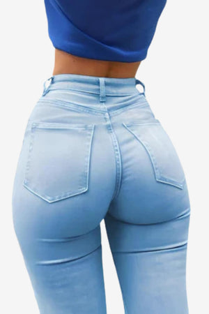 The Women's Light Blue High-Waisted Skinny Jeans are body-hugging trousers with a high-waisted silhouette. Made from a stretchy, soft-texture fabric, they suit various body types and are ideal for women seeking a versatile style for casual or semi-formal occasions.- Body-Hugging Fit: Skinny cut follows body's contours for defined shape.