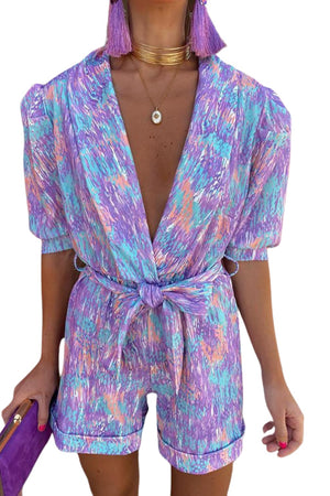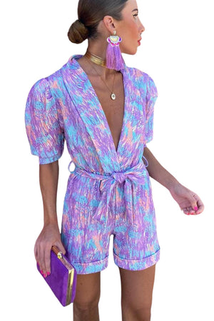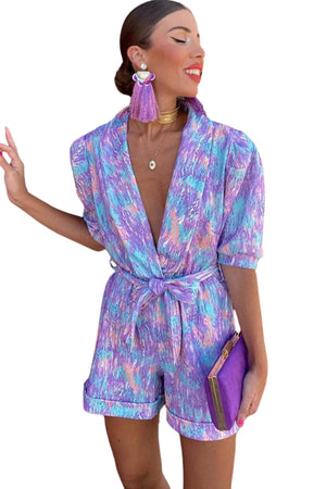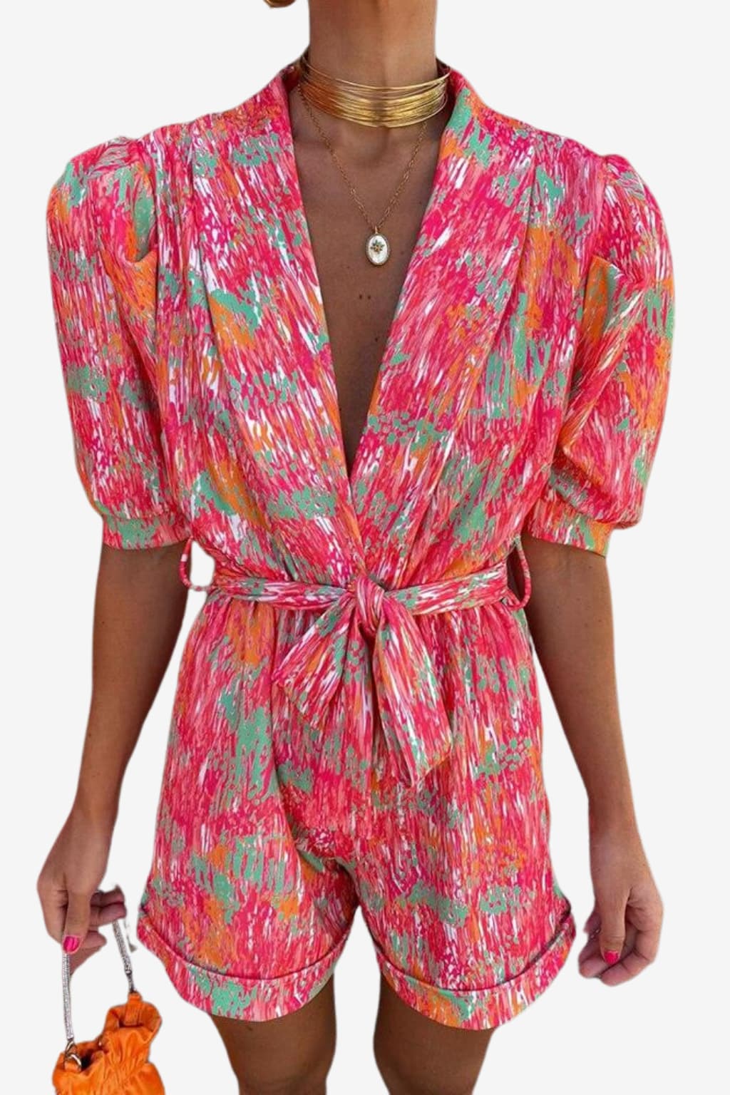 This one-piece jumpsuit features a blazer-style silhouette with a colorful pattern. Made from slightly textured fabric with a subtle sheen, it offers a tailored fit for women seeking a versatile garment for casual or semi-formal settings. The design includes short sleeves and rolled-cuff shorts for a structured look.- Adjustable Belt: Fabric belt cinches waist for a defined silhouette.