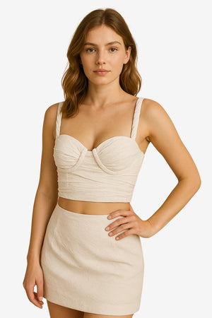 The Women's Khaki Crop Top is a fitted, sleeveless garment with a sweetheart neckline, designed for formal occasions. Its textured, non-sheer fabric provides a structured surface, ideal for women seeking a modern, tailored appearance with a smooth, non-stretch feel.- Fitted Silhouette: Tailored shape designed for various body types.