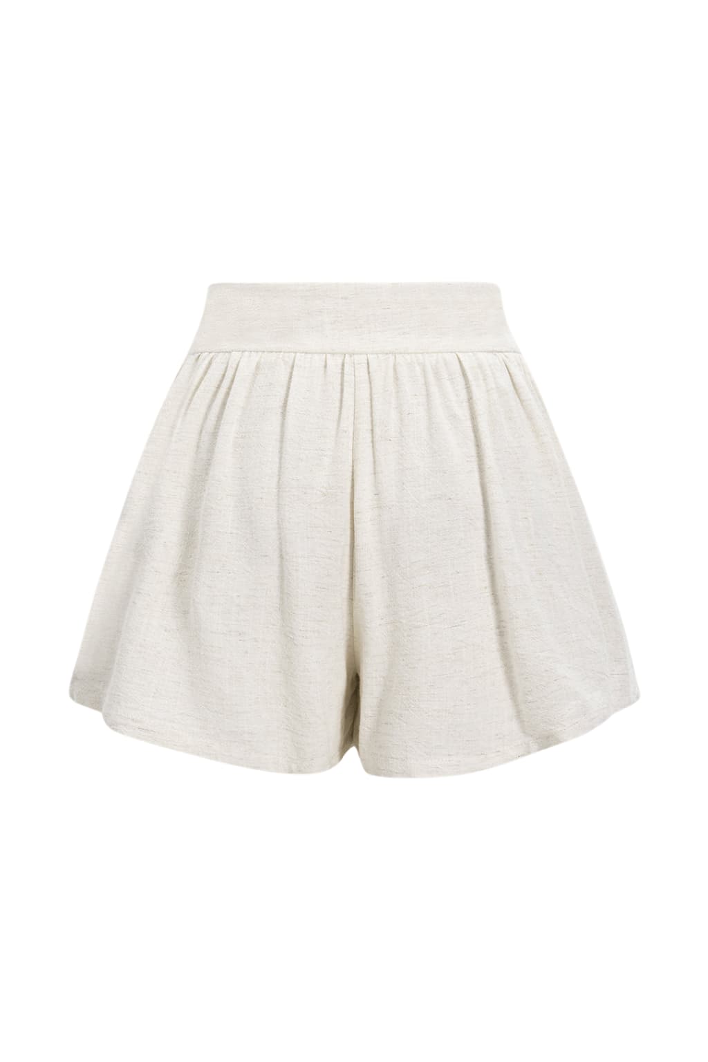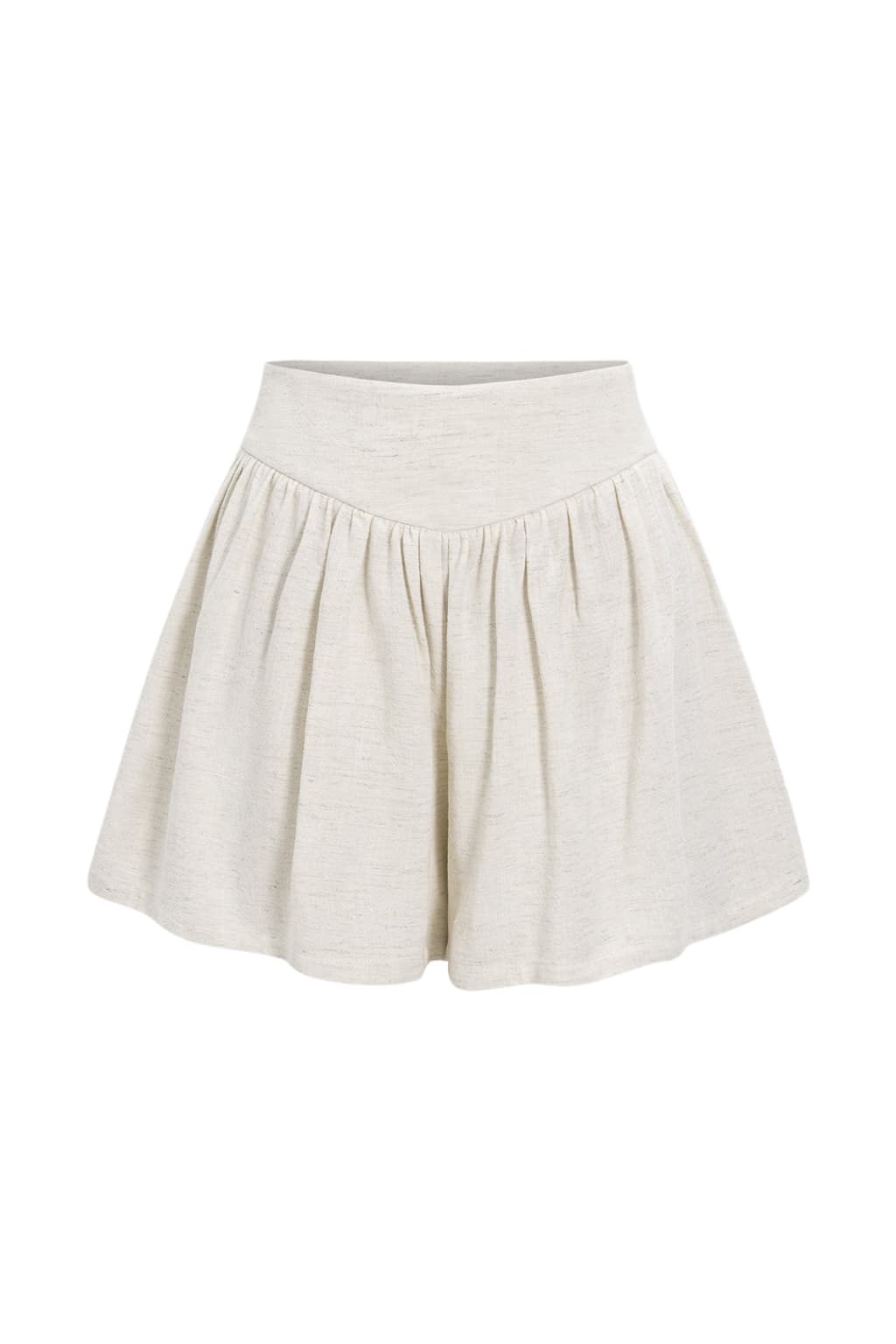 These women's high-waisted pleated shorts feature a wide cut and smooth surface texture, offering a shaped appearance suited to warmer conditions. Designed with a loose fit and subtle gathering, this piece provides structure while allowing ease of wear in casual contexts. The silhouette combines movement with form, supported by a simplified layout.- Wide elastic waistband: Holds securely while allowing natural stretch at the waist, eliminating the need for zippers or buttons.