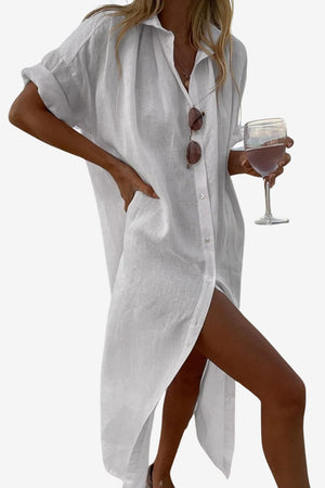 This Women's Long Shirt Dress is a loose-fitting, button-down garment with a smooth-textured fabric. Its relaxed silhouette and collared neckline make it suitable for women seeking a versatile piece for casual outings or beachwear, offering a practical design for warm weather.- Relaxed Fit: Oversized, flowy shape fits various body types comfortably.