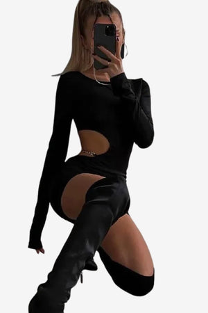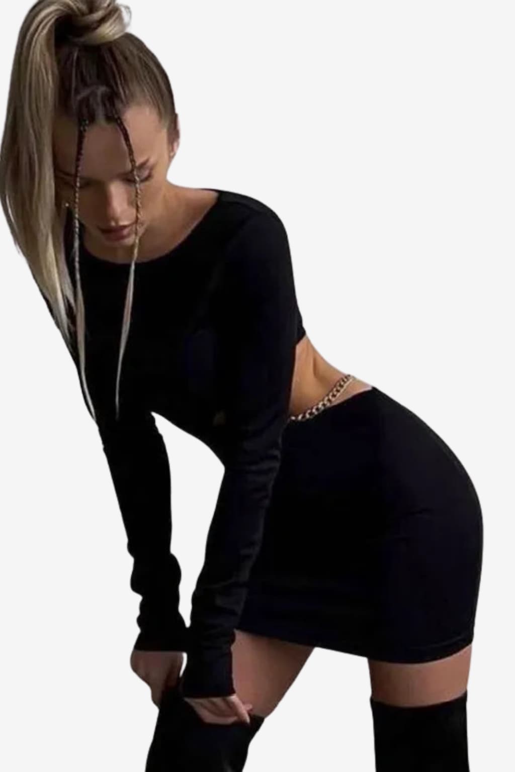 - Side Cutout with Chain: Waist cutout with chain detail adds visual interest.