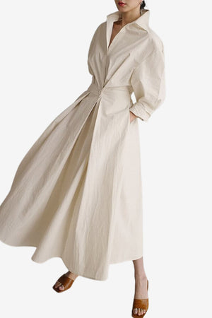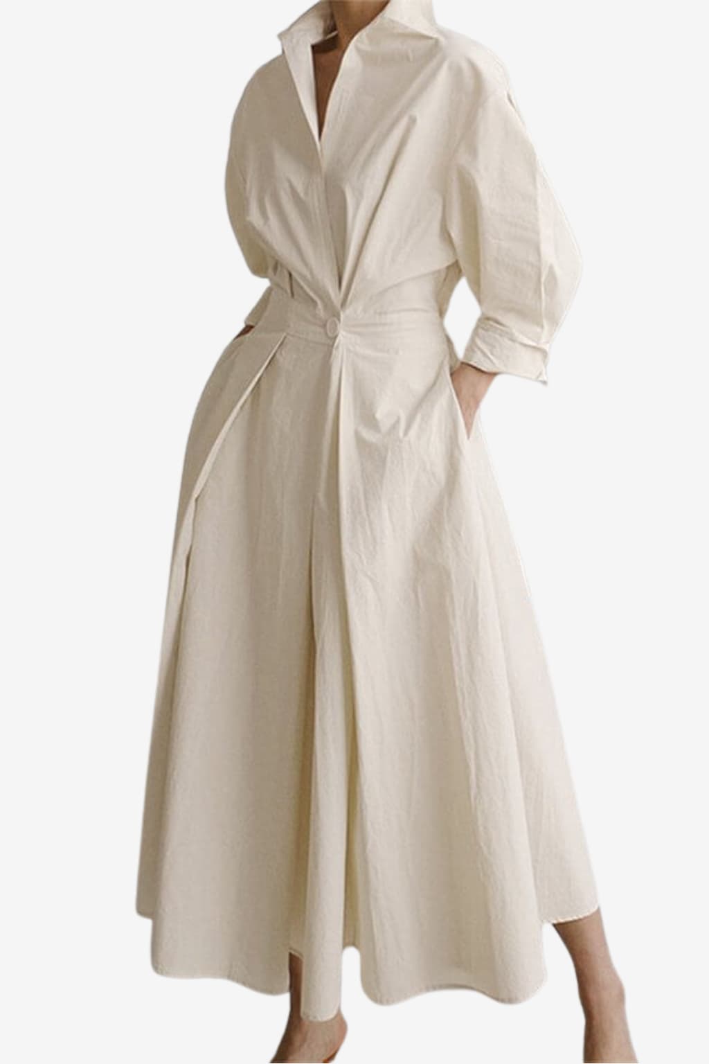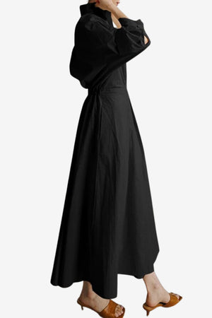 This full-length shirt dress features a structured collar, A-line silhouette, long sleeves, and an adjustable waist. Designed for use during spring and autumn, the dress presents a defined outline with layered construction and minimal surface variation, suitable for casual and semi-formal environments.- Oversized fit with waist shaping: Wide cut combined with a cinched waist supports structured form with room for movement.