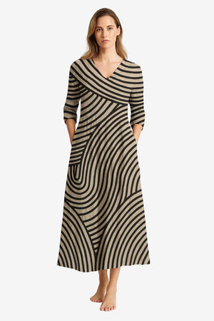 This full-length women’s dress features a relaxed structure and understated detailing in a linear silhouette. With a deep V-neckline, three-quarter sleeves, and a loose, straight fit, the design prioritizes ease of movement and a streamlined visual profile. Suitable for layering or warm weather, it combines minimal shaping with consistent surface form.- Loose, straight fit: Designed with a straight-cut profile that drapes evenly and maintains unrestricted structure throughout.