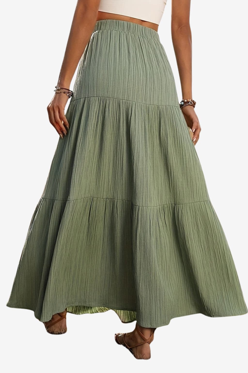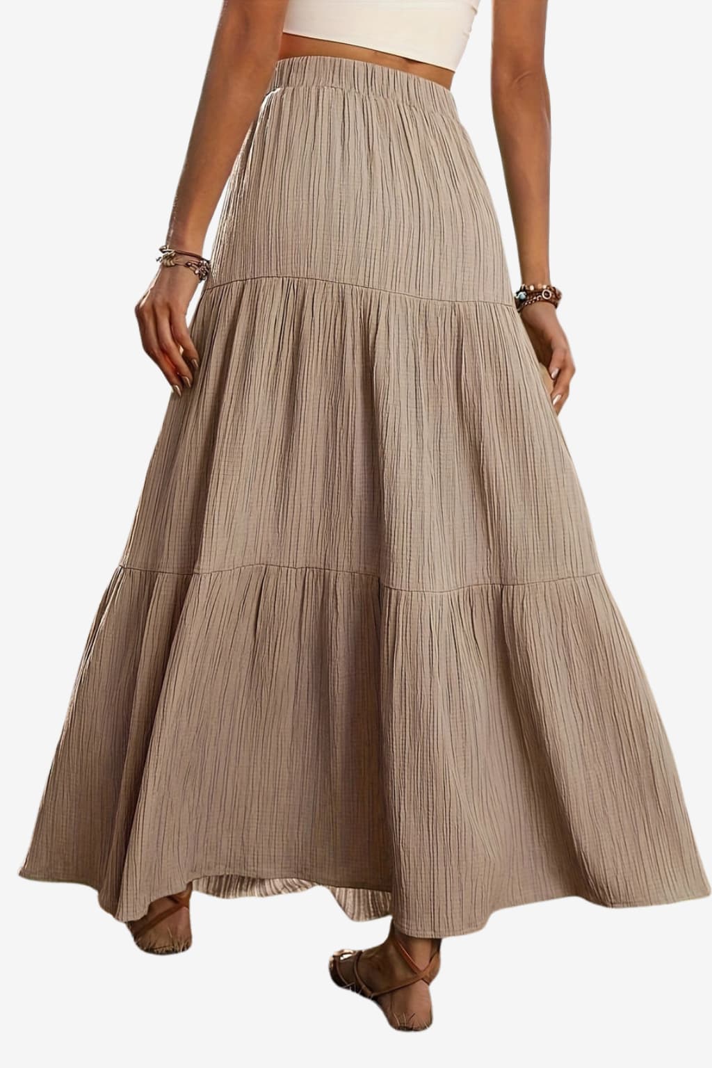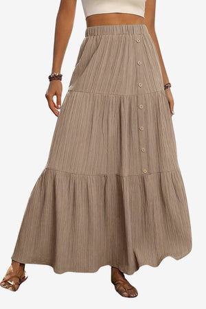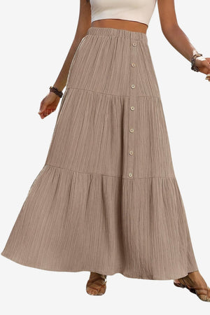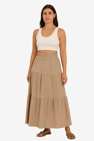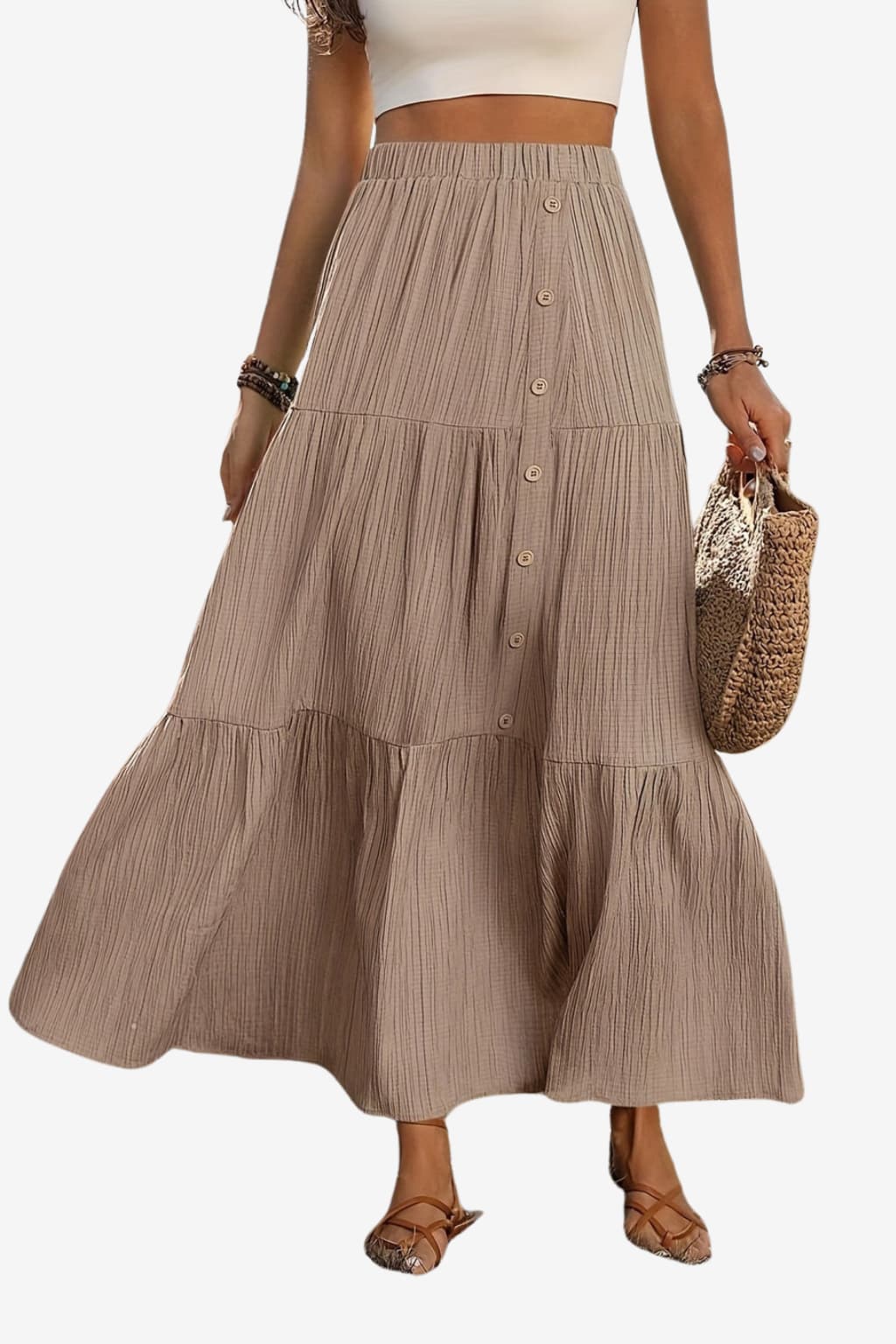 This women’s maxi skirt features a tiered silhouette with button accents and an adjustable elastic waistband. Designed for practical wear, it combines soft surface texture with layered structure, offering a piece that maintains a composed look across various settings. With its neutral tone and stretch waist, the skirt accommodates a range of sizes and styling preferences throughout the year.- Elastic waistband: Provides an adjustable fit at the waist without relying on zippers or closures.