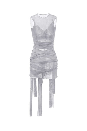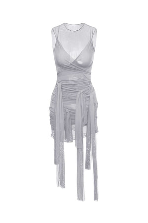 This women’s mesh ruched mini dress features a sleeveless, close-fitting shape designed with layered materials and adjustable components. A semi-sheer outer surface overlays an opaque inner lining, providing visual depth and practical coverage. Suitable for events, it offers a compact form with adaptable elements in a straightforward structure.- Bodycon silhouette: Follows the body's outline with a mini-length hem, shaped for a fitted appearance.
