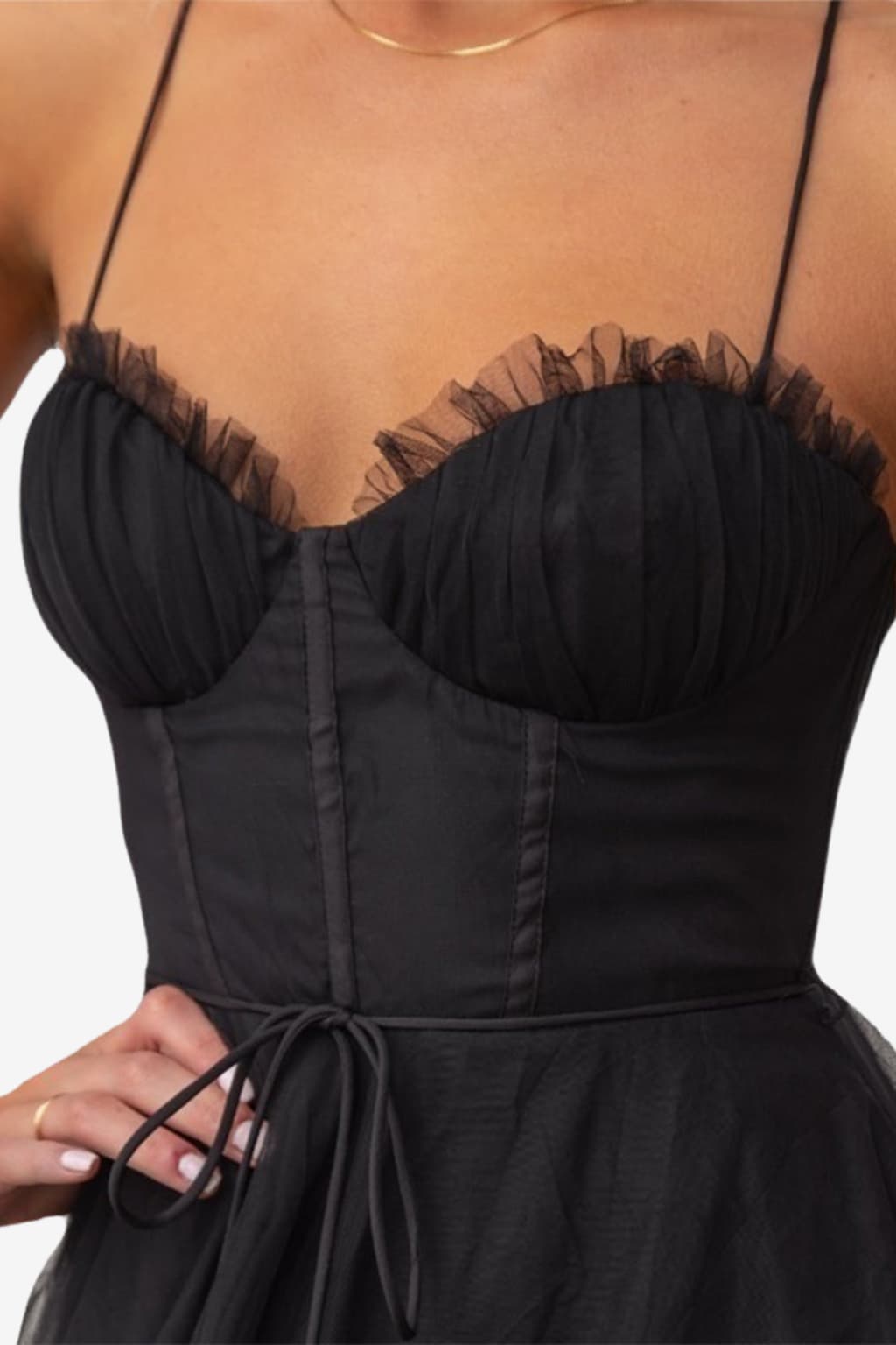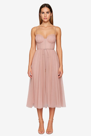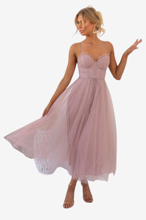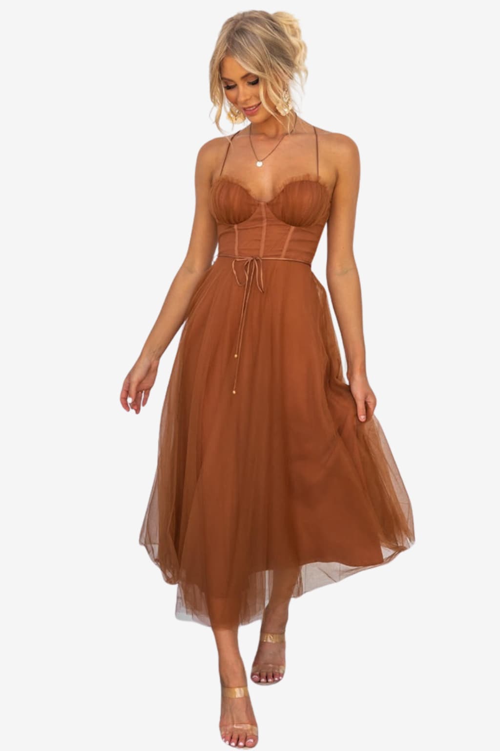The Women's Midi Tulle Dress features a fitted bodice and a flowing tulle skirt, designed for semi-formal occasions. Its lightweight fabric and structured fit suit various body types, offering a balanced silhouette for events like weddings or parties.- Structured Bodice: Fitted design with defined waistline suits multiple body shapes.