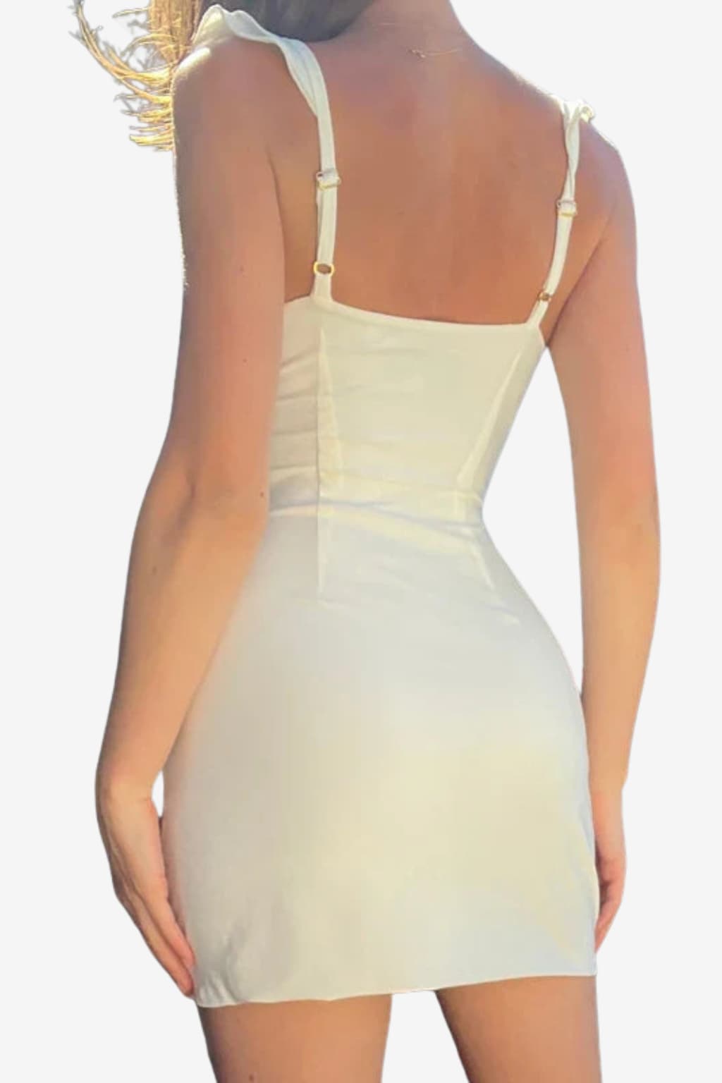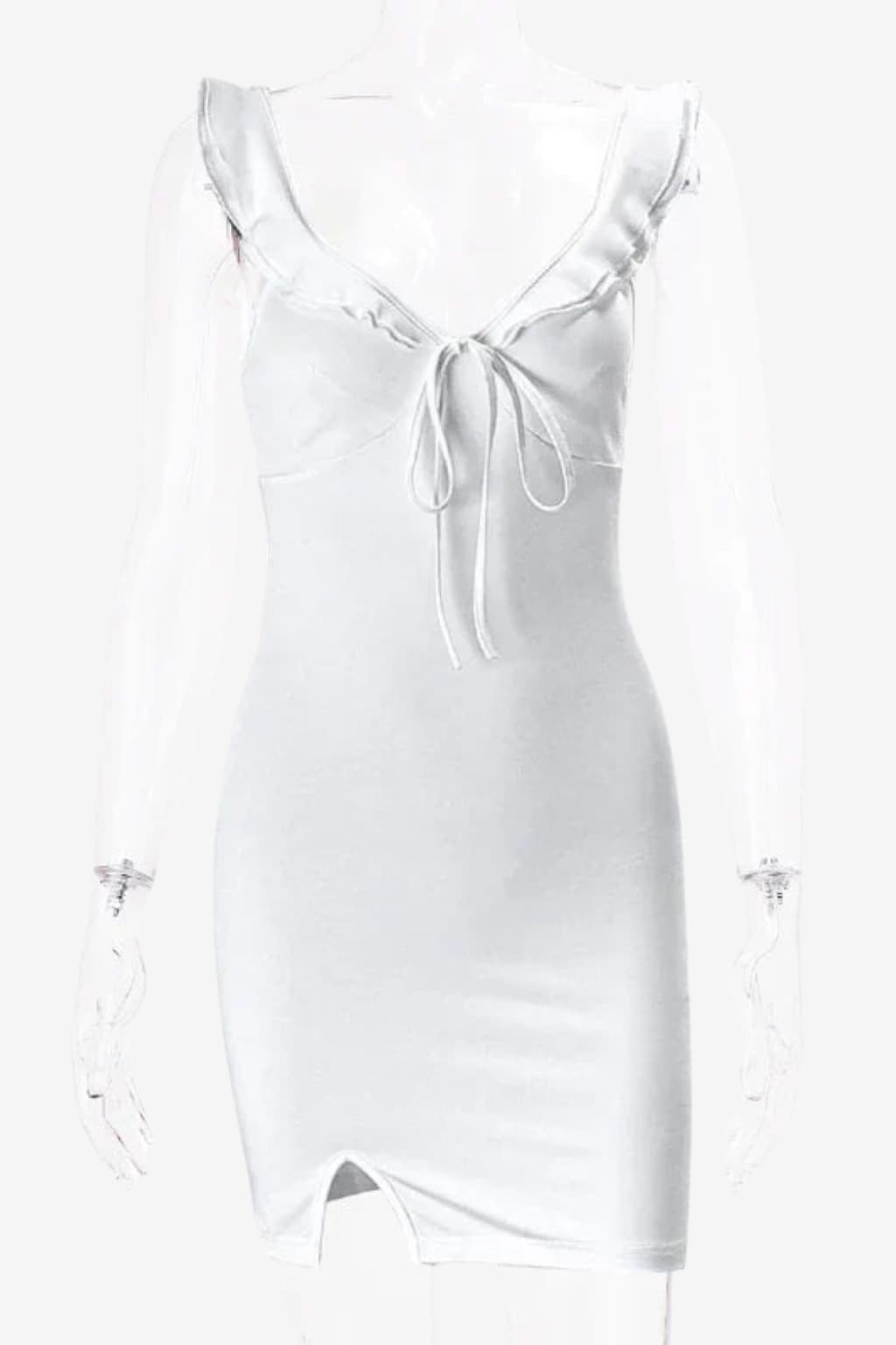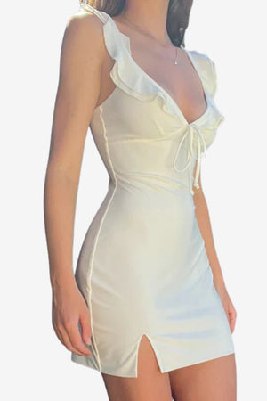 This women's mini dress features a defined silhouette with a flexible feel and smooth texture. Its ruffle accents and side slit suit various occasions, such as dates or summer outings, for a versatile look.- Defined Silhouette: Flexible structure adapts to different body shapes.