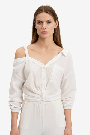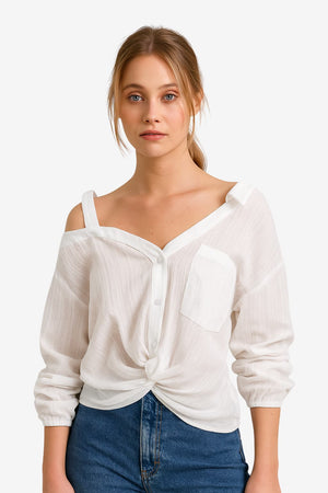 Women's Off-Shoulder Long-Sleeve Casual Shirt with Tie-Front