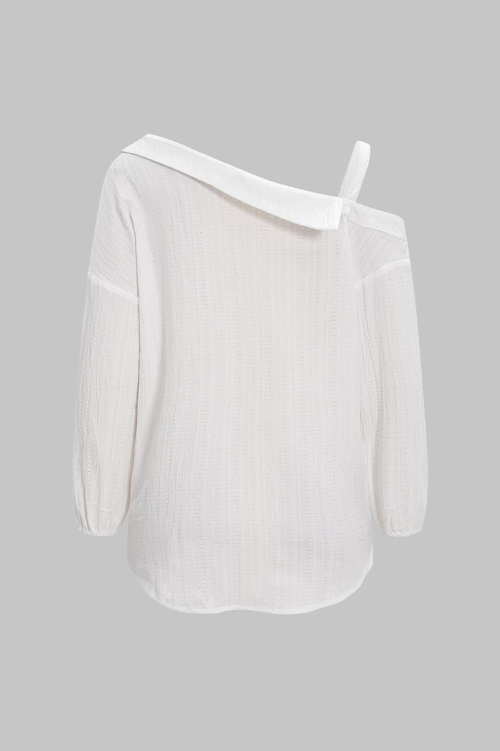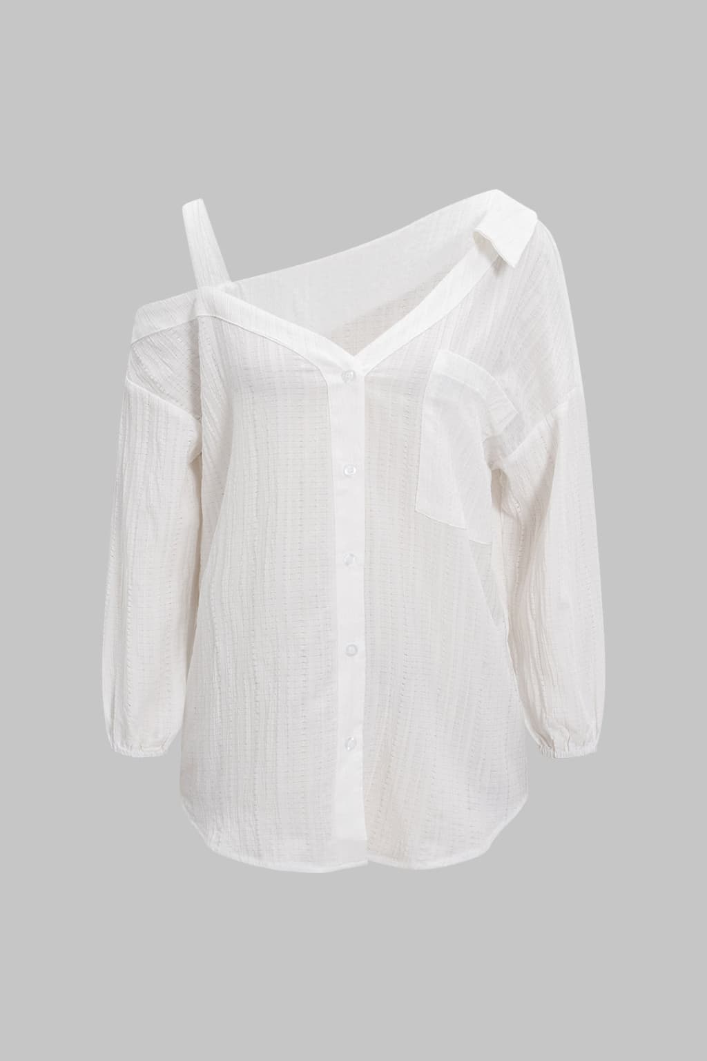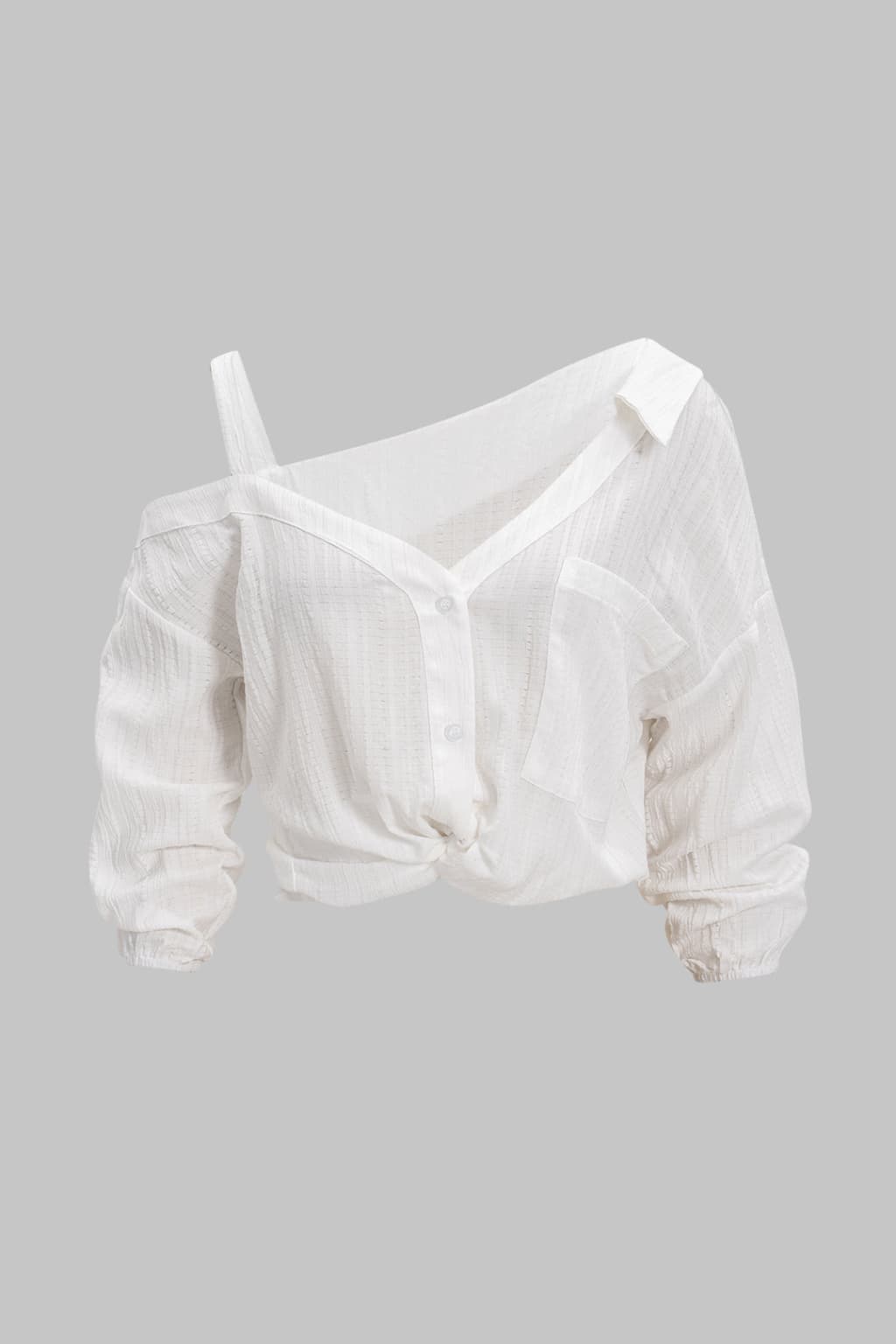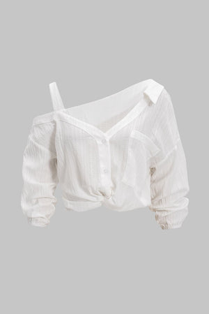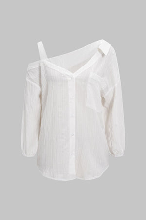 This Women's Off-Shoulder Long-Sleeve Casual Shirt features a loose silhouette with a textured, non-sheer fabric. The tie-front detail and button-down closure add functional style, suitable for warm weather or casual settings. Designed for women, it offers a modern one-shoulder look with a collar and thin strap.- Loose Silhouette: 39.8" bust, 26.8" waist (size S) fits various shapes.