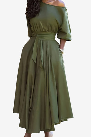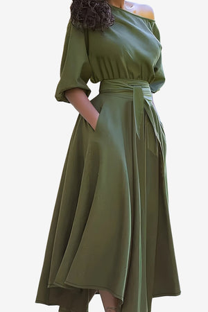 Women’s Off-Shoulder Midi Dress with Belt and Pockets