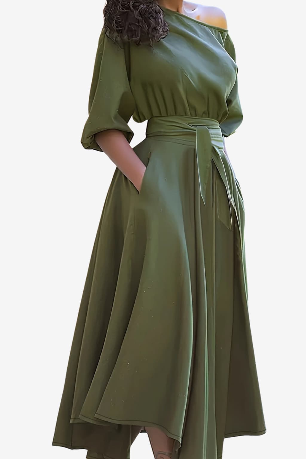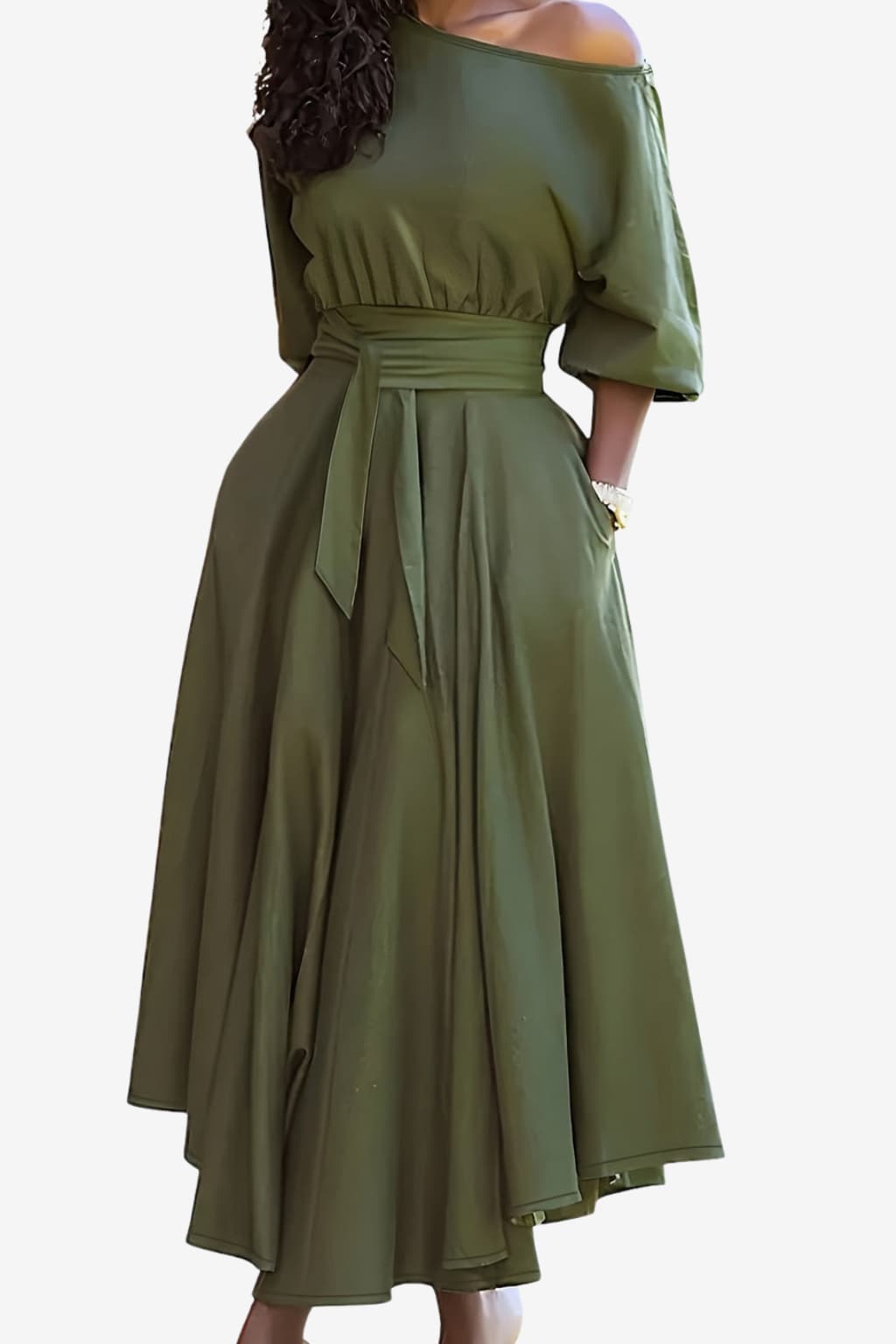This off-shoulder midi dress presents a blend of shaping and relaxed form, designed with a flared silhouette and minimal surface detail. The asymmetric hem and matching belt provide structured variation, while practical features such as side pockets contribute to its functional use. Developed for wearers seeking a straightforward garment with multipurpose application, this piece allows natural movement.- Off-shoulder neckline: Positions just beneath the shoulders, forming a clear upper line while maintaining full arm range.