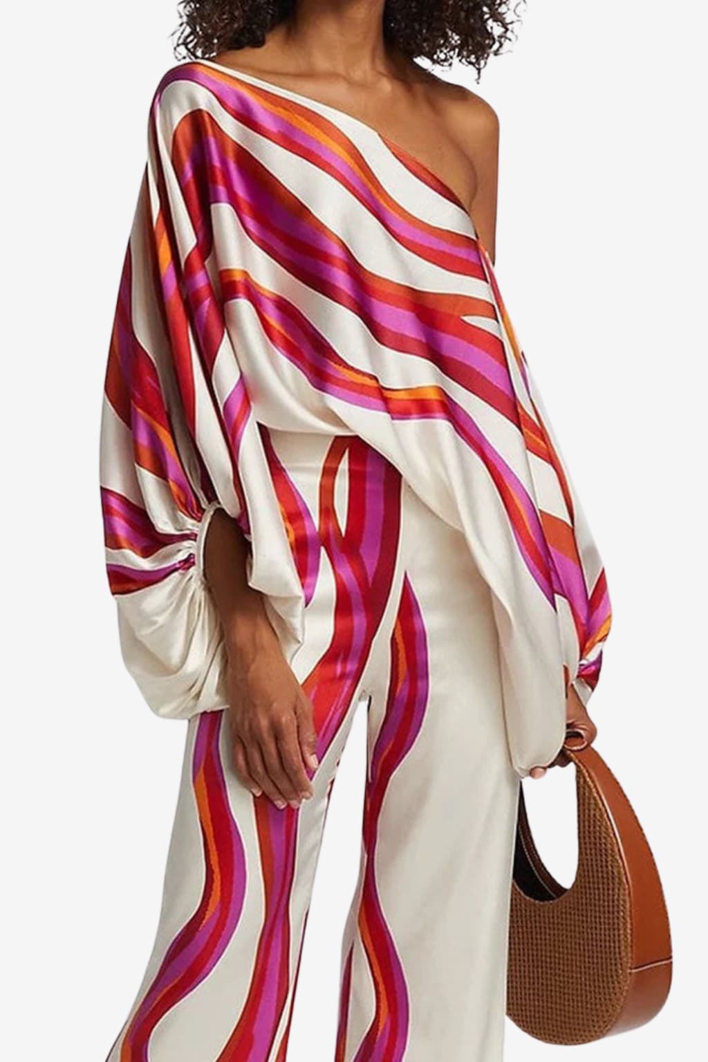 This outfit includes an off-shoulder blouse paired with wide-leg trousers, shaped to offer a continuous outline and defined surface texture. The top is constructed with an angled hem and gathered sleeves, while the trousers extend straight from the waist to provide full-length coverage. The set features a multicolored striped surface for consistent styling across components.- Off-shoulder sleeves: Upper section includes a shoulder-revealing cut with gathered sleeve shaping for visual distinction.