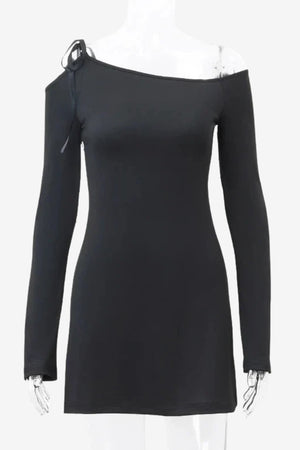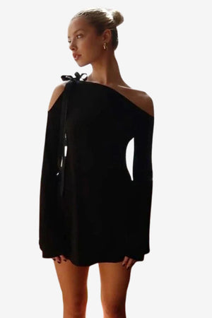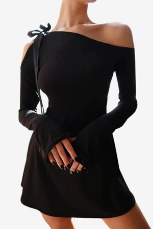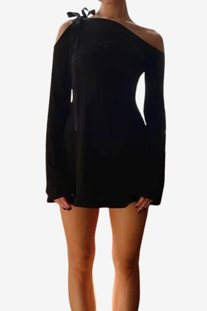 Women's One-Shoulder Mini Dress with Long Bell Sleeves and Bow