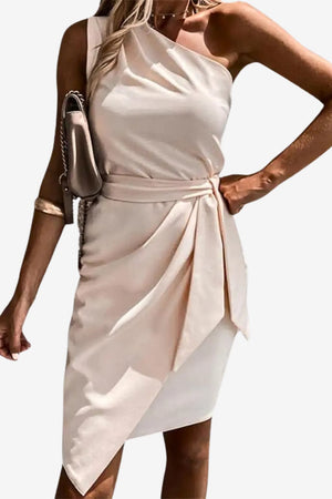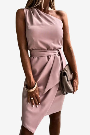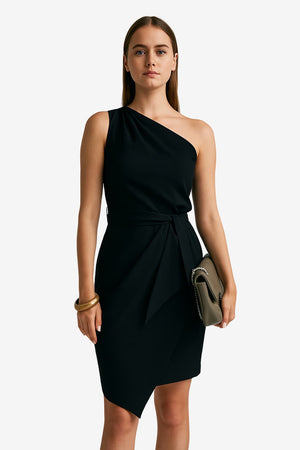 The Women's One-Shoulder Mini Dress with Waistband is a fitted garment featuring a single-shoulder neckline and a cinched waist. Its lightweight fabric with a subtle sheen and draped detailing offers a tailored appearance suitable for various occasions, such as evening events or social gatherings.- Adjustable Fit: Fitted silhouette with waistband for personalized sizing.