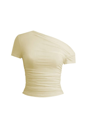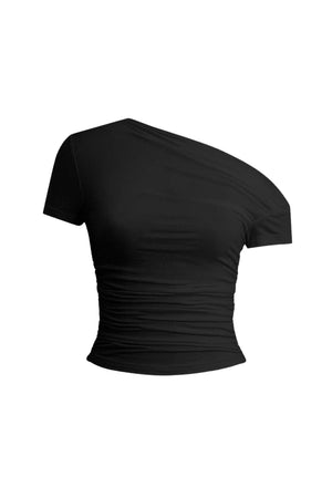 This one-shoulder fitted top features an angled neckline and ruched side details, combining a shaped outline with flexible construction. Its structured form and moderate elasticity allow for a close fit while maintaining ease of motion. Designed for casual use, it suits those interested in minimalist cuts with visual variation.- Asymmetrical neckline: Includes a one-shoulder design with a short sleeve on one side, creating a directional silhouette.