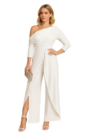This one-shoulder jumpsuit includes a shaped upper section and wide-leg lower form, designed with an asymmetrical neckline and flowing leg overlay. Constructed for formal settings, the piece maintains defined lines through the top and a relaxed fit below the waist.- Asymmetrical neckline: One-shoulder design includes a single sleeve and angular cut at the upper body.