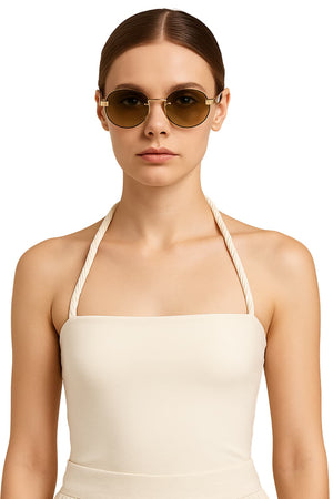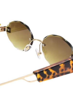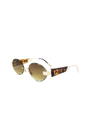 These women's oval sunglasses include a metal frame with defined edges, offering a balanced design between familiar and updated shapes. Intended for regular use, they feature gradient green lenses and a metallic surface, combined with patterned side arms that introduce varied texture. Designed to provide a distinct frame outline suitable for daily settings.- Angular oval shape: Includes rounded lenses with light angular definition, providing a revised version of a familiar form.