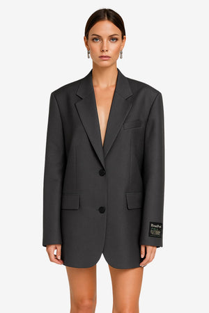This oversized longline blazer jacket in dark grey applies a current cut to classic outerwear forms. Featuring a boxy silhouette and longer hemline, it provides a loose structure that accommodates layering. Designed with a matte-finish surface and defined outline, the piece offers a stable shape without a close-fitting profile.- Oversized, boxy shape: Designed with a loose cut that allows for layering and movement, contributing to a non-restrictive outline.