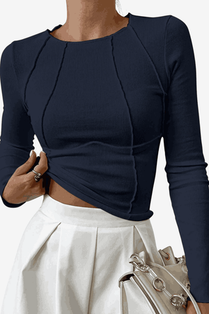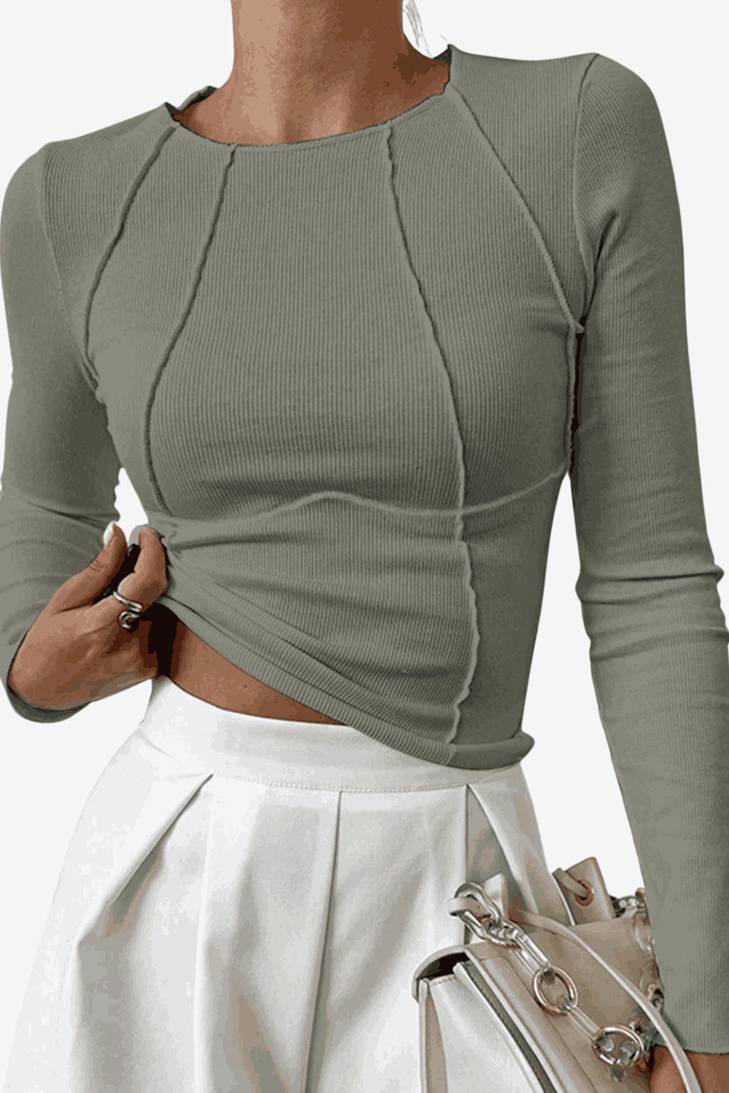 This women's piping long sleeve top is designed with sleek details and a comfortable fit, making it a versatile addition to any casual wardrobe. Featuring a ribbed design and unique piping, this top can be layered or worn alone for a simple look.- Piping Details: Includes decorative exposed seams that contour the body, enhancing the overall design.