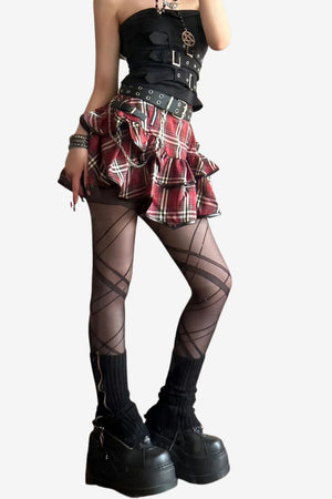 This women's plaid mini skirt presents a high-waisted, layered design with multiple visual elements. Created for individuals who prefer structured, patterned garments, the piece includes a check pattern along with decorative fastenings. The skirt combines contrasting details and form, contributing to outfits suitable for varied personal styles.- Layered ruffle structure: Multi-level design introduces surface variation and shape at a shorter length.