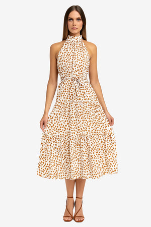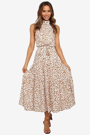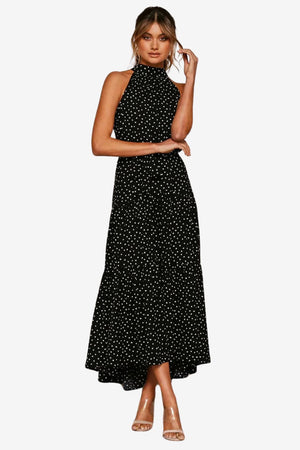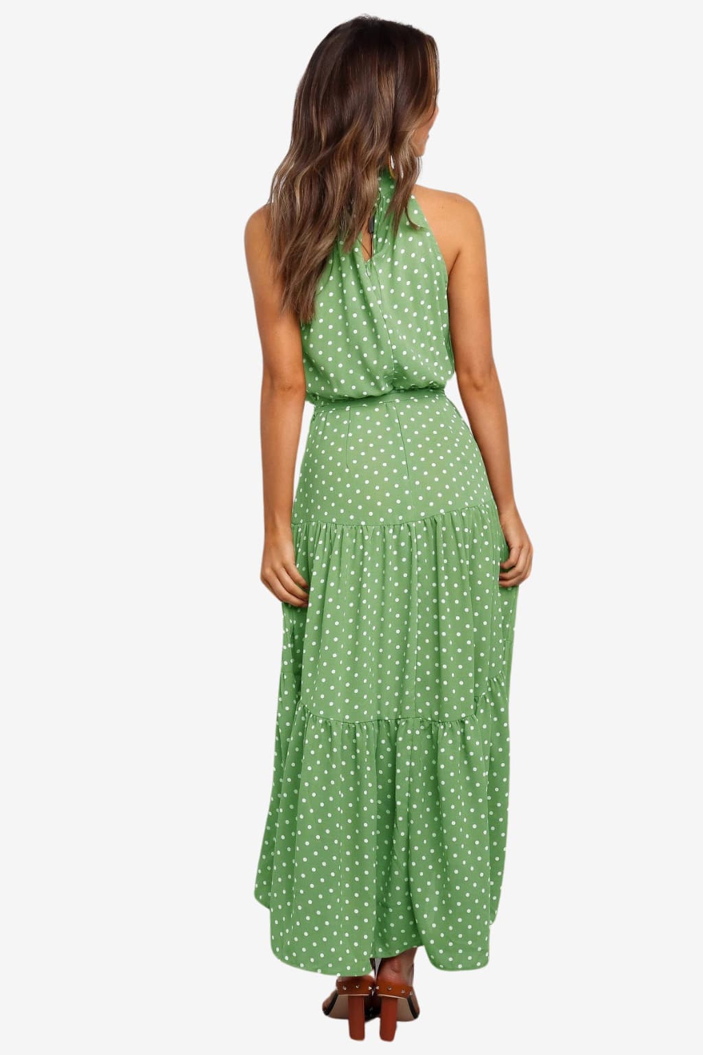 This sleeveless halter midi dress features a polka dot pattern combined with a shaped silhouette suited for regular use. The adjustable waist tie and layered skirt contribute to form and ease of motion, making it suitable for warm conditions or informal settings. A gathered neckline and asymmetrical hem create a balanced visual layout with a straightforward fit.- Adjustable halter neckline: Secured at the back with a tie or button, the neckline includes a gathered construction that adds dimension and ensures a stable fit at the upper section.