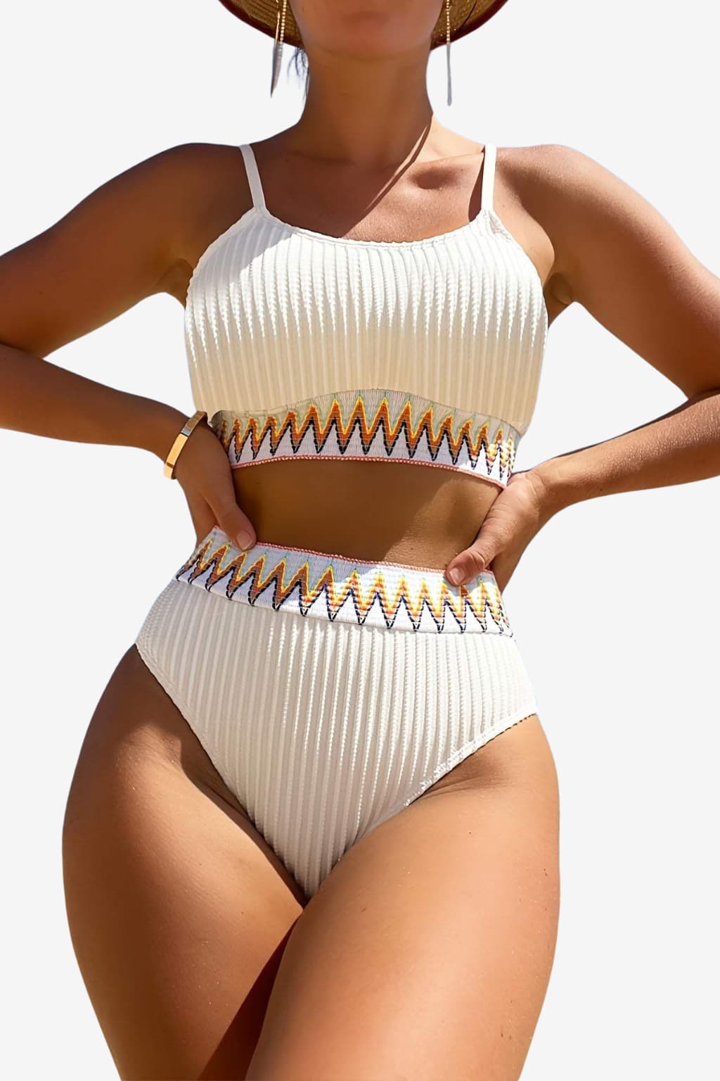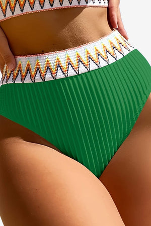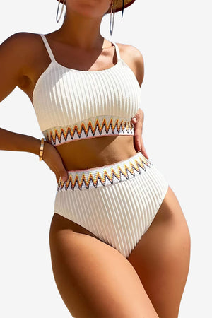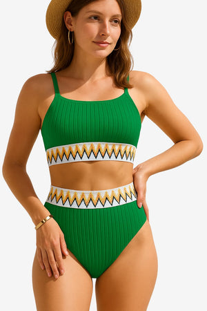 This two-piece bikini set includes a bandeau-style top with high-waisted bottoms. Designed with a ribbed finish and zigzag pattern details, the set features a structured silhouette and adjustable strap placement. Suitable for water use or outdoor settings, the design supports visual uniformity and secure fit across the upper and lower sections.- Adjustable shoulder straps: Thin straps on the top section allow for position adjustment to suit different preferences.