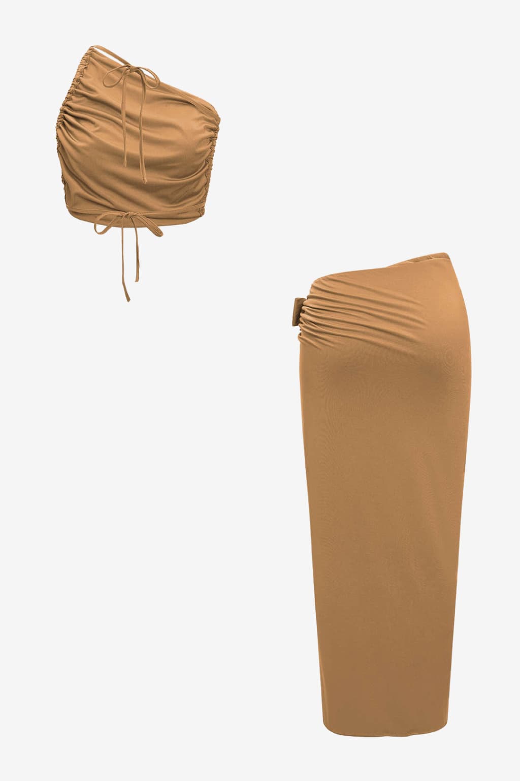This Women's Ruched Crop Top & High-Slit Maxi Skirt Set includes a one-shoulder crop top and a high-waisted maxi skirt. The smooth, low-stretch fabric provides a fitted silhouette, suitable for casual occasions. The design features ruched detailing and a side slit for added movement.- Fitted Design: Crop top and skirt contour the body with a tailored shape.