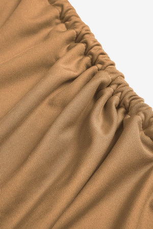- Ruched Texture: Gathered fabric on top and skirt adds a draped effect.