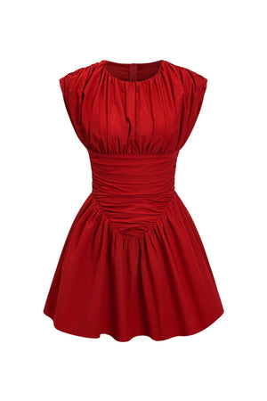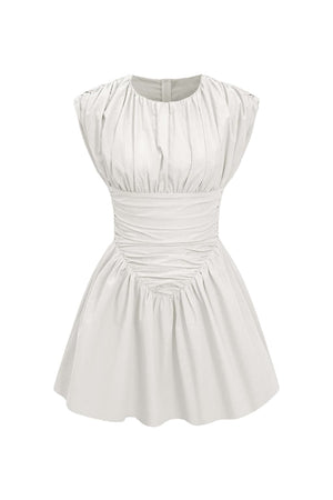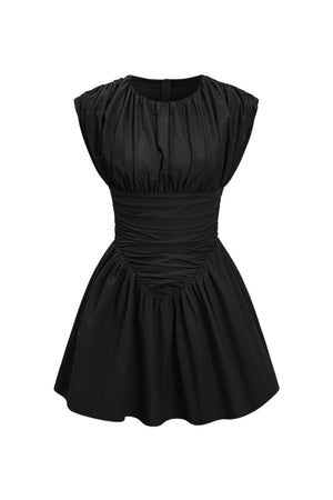 This women’s ruched mini dress is a cap-sleeve style designed with a close-fitting shape and gathered front detailing. Featuring a round neckline and surface texture, it offers a form-conscious look suitable for relaxed settings. The construction combines visual definition with a stable, non-restrictive cut.- Ruched bodice and waist: Gathered detailing adds surface variation along the front and introduces shape around the midsection.