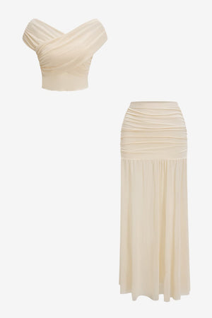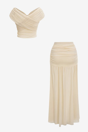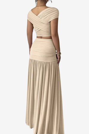 Women's Ruched Off-Shoulder Crop Top and High-Waisted Long Skirt Set