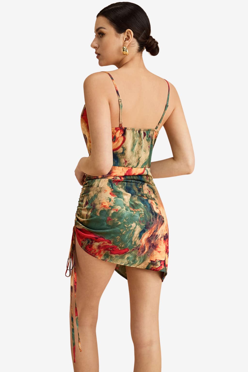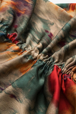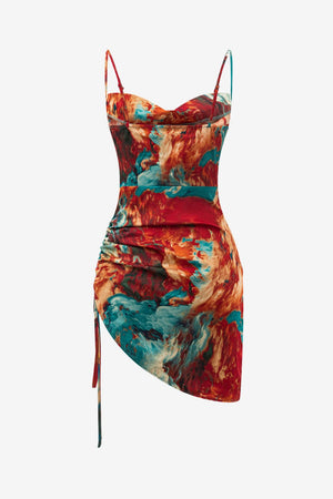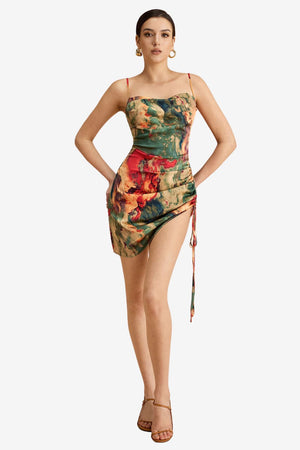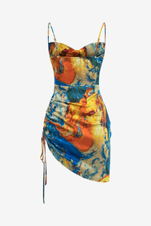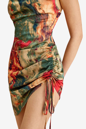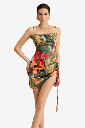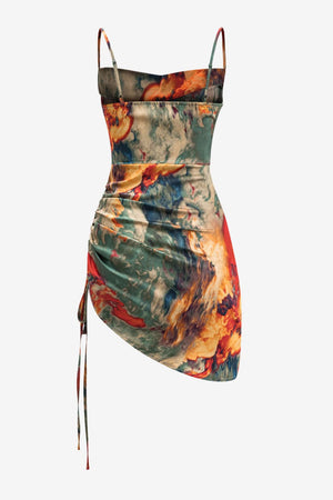 Women’s Ruched Satin Mini Dress Watercolour Print Slip