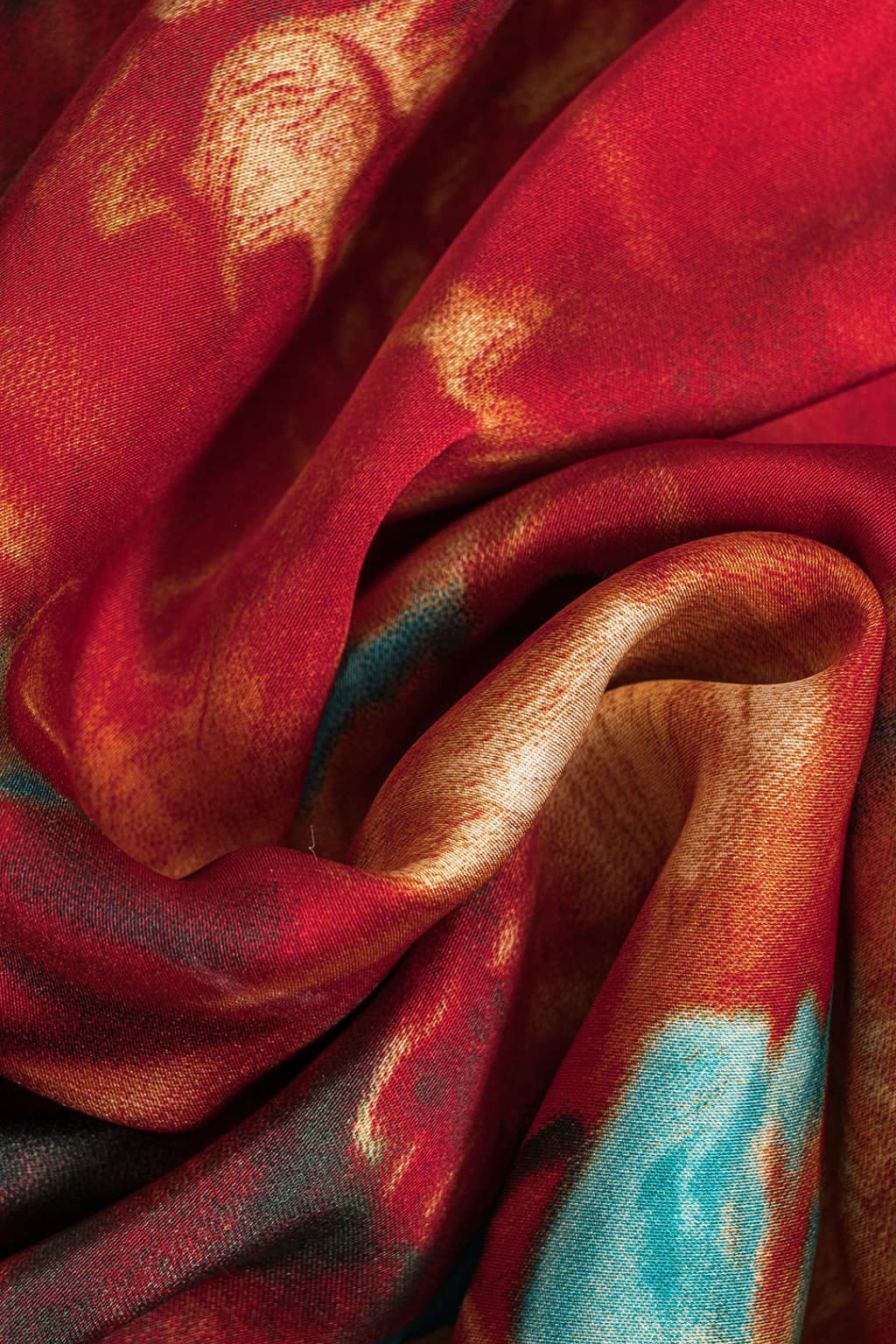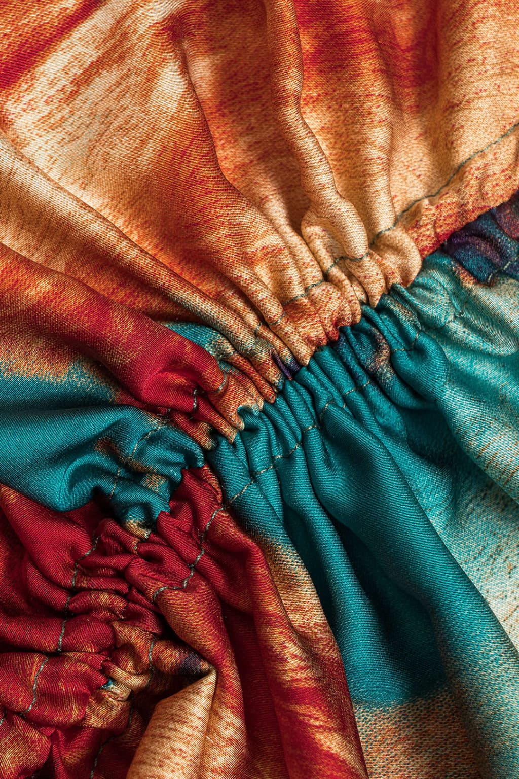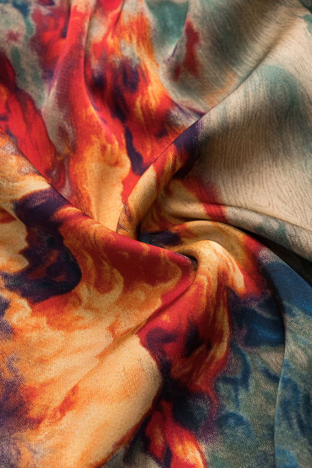 - Multicolor abstract print: Features a pattern with layered green, red, and beige tones arranged in an asymmetric layout.