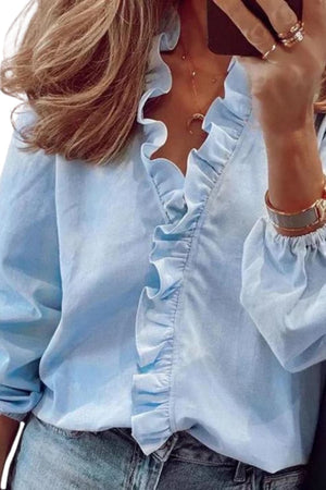 This blouse features a V-neck with light ruffle trim and extended sleeves shaped for volume. Created for versatile use, the relaxed structure and consistent surface form support layering or standalone styling. The cut is designed to align with varied bottom pairings for day-to-evening settings.- Ruffled V-neckline: Deep neckline trimmed with small ruffles for added edge definition and upper shaping.