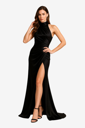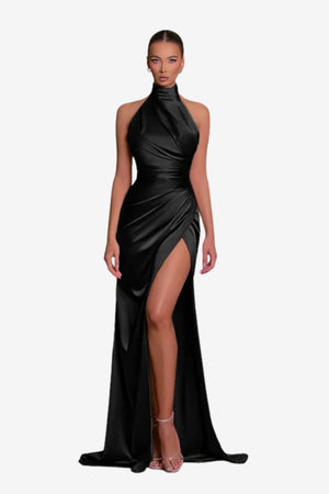 This women’s evening dress features a high neckline and full-length format with a structured slit, designed for formal events. The surface has a satin-style texture that reflects light evenly, while the shaped fit and asymmetrical layering follow the form in a controlled outline. Suitable for formal gatherings or event-based occasions, it offers a shaped presence that pairs with minimal accessories or standard footwear.- High halter neckline: Encircles the neck with structured coverage, maintaining an upper-body frame appropriate for formal use.