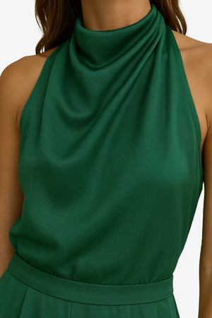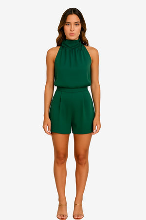 This women's halter romper is a sleeveless one-piece with a smooth, light-reflecting finish and a form that balances relaxed and structured elements. Designed for a range of social settings, the garment combines a flow-based upper section with shaped shorts, offering a practical outfit option for coordinated styling.- Draped halter neckline: Includes a softly layered neckline that ties at the back, providing a stable fit and defined upper shape.