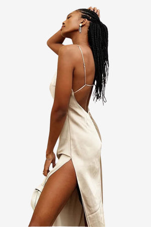 Women's Satin Maxi Dress with Deep V-Neck and Side Slit
