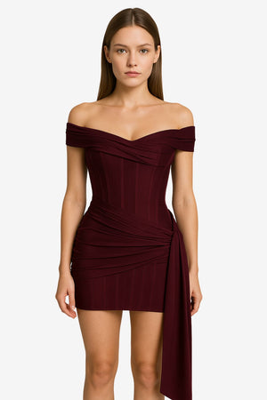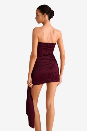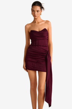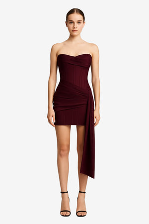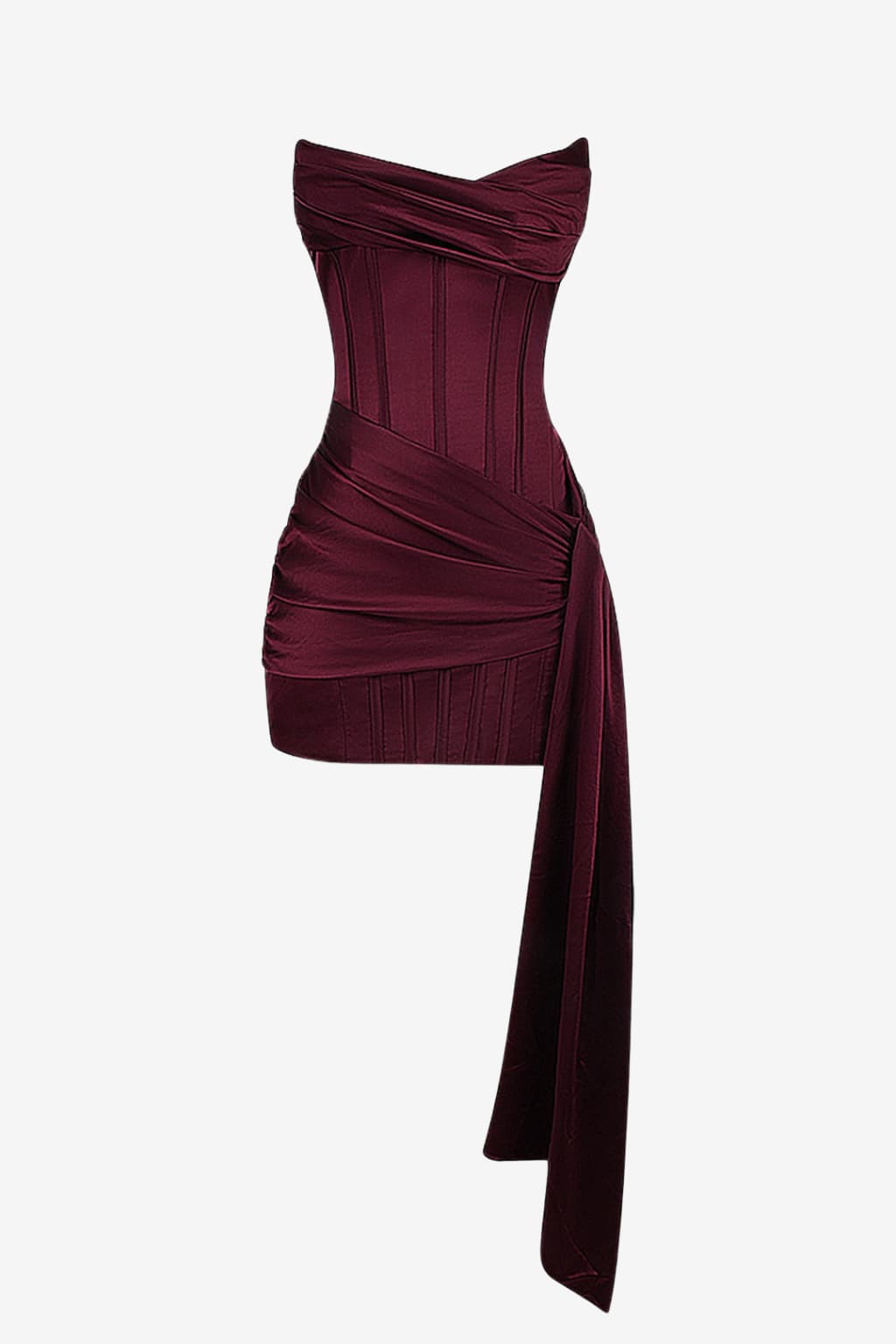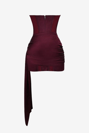 This Women's Strapless Corset Mini Dress features a structured bodice and flowing panels. Its smooth, glossy texture and short hemline create a tailored silhouette suitable for parties or special occasions. The strapless neckline and vertical seams enhance its distinct appearance for evening events.- Fitted Bodice: Structured with vertical seams for a tailored silhouette.