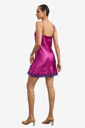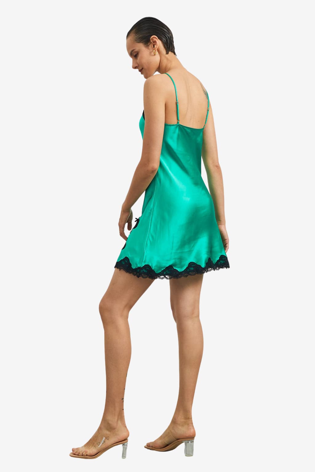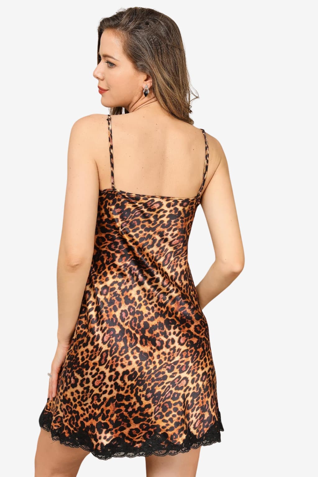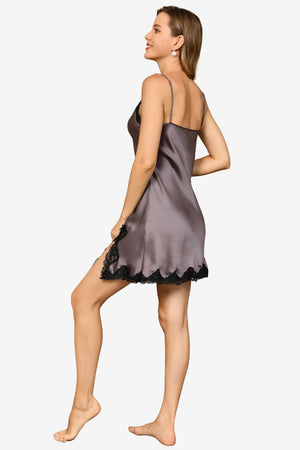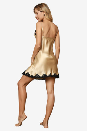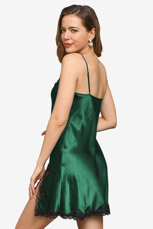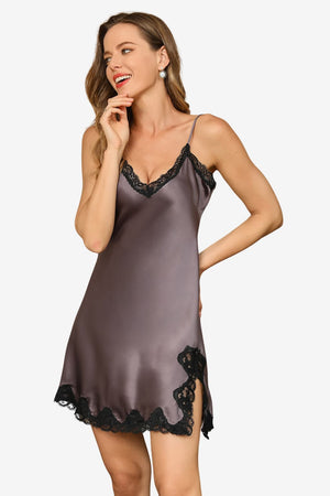 This Women's Satin V-Neck Nightgown with Lace Trim is a sleeveless, mid-thigh length slip dress. It features a smooth, lightweight fabric with black lace details along the neckline and hem. The design includes adjustable straps and a side slit, suitable for women seeking a garment for lounging or sleeping.- Adjustable Straps: Thin straps allow for a customized fit.
